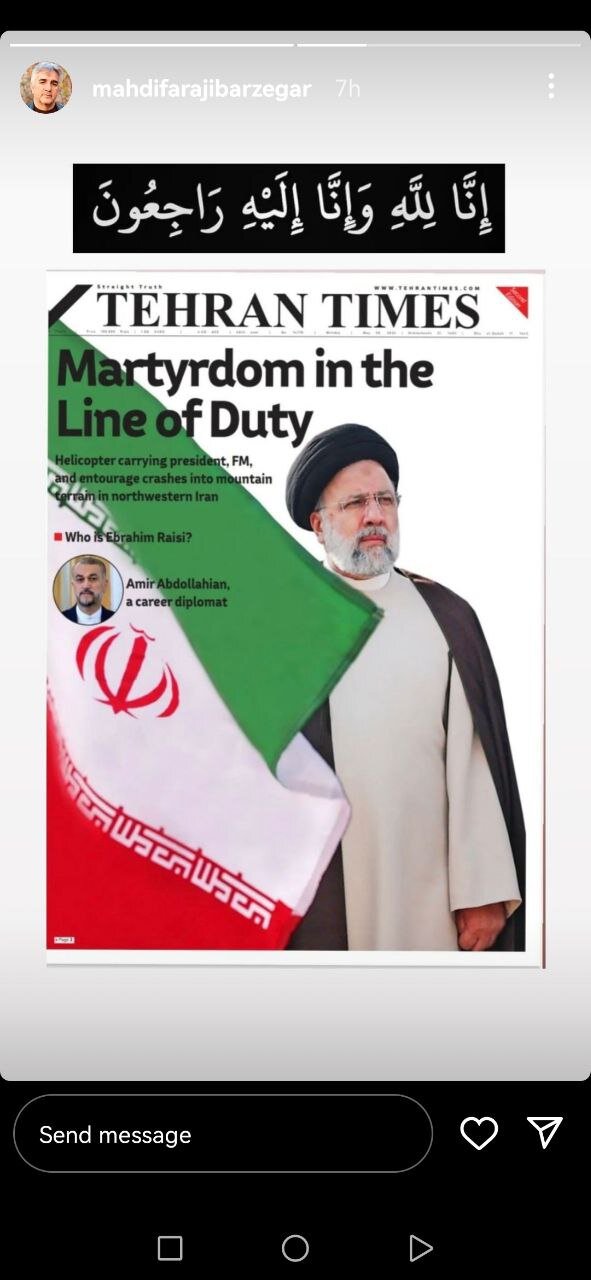 به ملت شریف ایران و خانوادههای محترم شهیدان بزرگوار جناب آقای آیتالله رئیسی و همراهان ایشان تسلیت عرض میکنم. از خداوند بزرگ صبر و شکیبایی برای بازماندگان عزیز و آرزوی موفقیت برای جانشین ایشان و آیندهای روشن برای این مرزو بوم دارم.