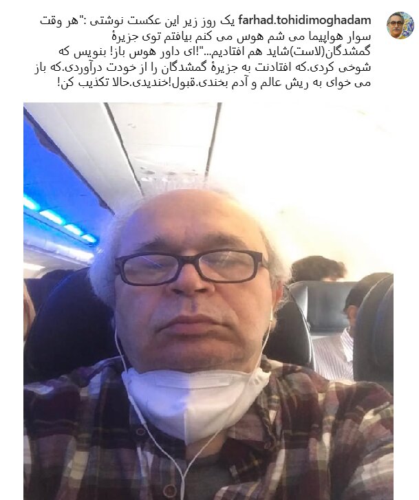به گزارش خبرگزاری خبرآنلاین، فرهاد توحیدی فیلمنامهنویس با انتشار پستی در اینستاگرام برای ابراهیم نبوی نوشت: «یک روز زیر این عکست نوشتی :"هر وقت سوار هواپیما می شم هوس می کنم بیافتم توی جزیرهٔ گمشدگان(لاست)شاید هم افتادیم…"!ای داور هوس باز! بنویس که شوخی کردی.که افتادنت به جزیرهٔ گمشدگان را از خودت درآوردی.که باز می خوای به ریش عالم و آدم بخندی.قبول!خندیدی.حالا تکذیب کن!»